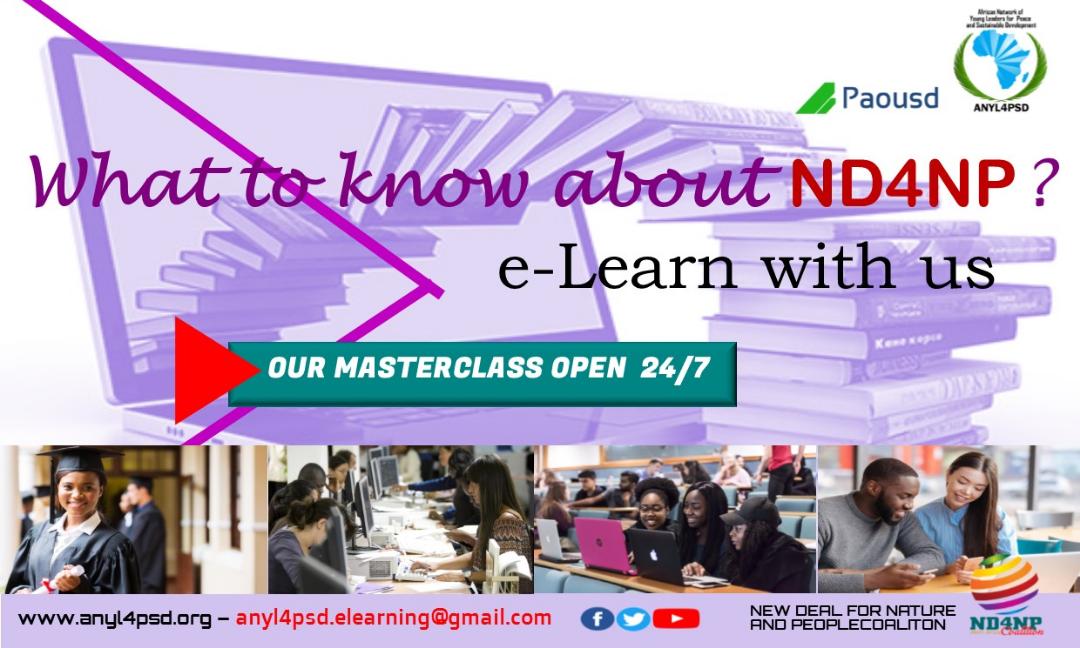 The challenges described above need to be addressed and in a manner that does not undermine African countries ability to sustain progress. Addressing the aforementioned challenges requires the involvement of youths. African youth have a role in transiting from unwitting perpetrators of environmental degradation to custodians of natural capital. Such a changeover will potentially result in sustainability benefits like green jobs. However, despite the recognition of the important role of the youth in the delivery of green growth, and ultimately sustainable development, not enough has been done to enhance their ability to drive this agenda. Building their capacity would enable them to possess participatory competencies, management competencies, technical competencies and transformational competencies towards green growth and contributing to positive socio-economic transformation of African continent. Therefore, African Network of Young Leaders for Peace and Sustainable Development (ANYL4PSD) implement as part of his online university, a Massive Online Open Courses (MOOC) on the New Deal for Nature and People.